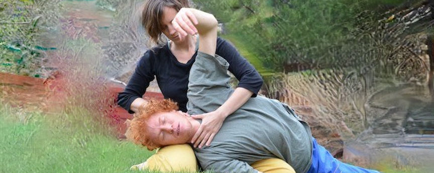 Une partie de nos explorations sera plus « relationnelle ». Cette partie comprendra l’exploration en détail de la réception active du bodywork et de donner du soin à quelqu’un.e qui bouge. Donner un soin à une personne en mouvement développe un certain type de sensibilité à la fois chez la personne qui donne et chez celle qui reçoit. Chez la personne qui donne, cela développe des capacités à lire le mouvement de l’autre par le toucher ; soutenir quelqu’un.e et aussi la laisser faire. En cela, la personne qui reçoit explorera différents types de réceptivité, de tonalite, de repos et d’activation.